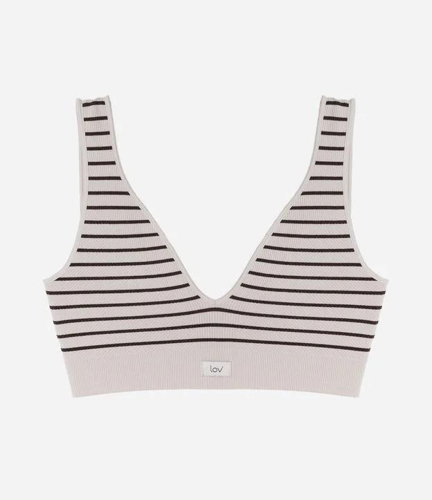 Sutiã top feminino confeccionado em poliamida. Possui malha canelada, decote frontal em v profundo, decote nas costas em u, listras horizontais, alças largas e bojo removível.