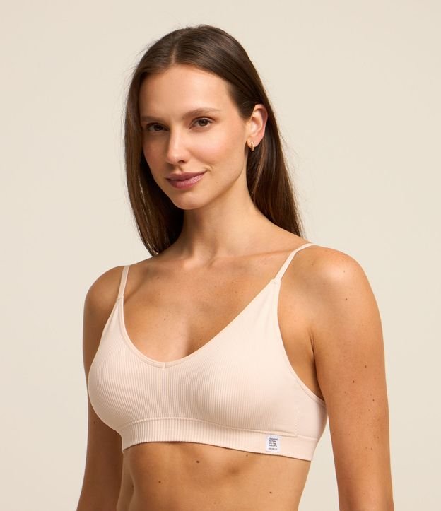 Sutiã top sem bojo e sem aro em microfibra, com alças reguláveis e textura canelada. A peça possui uma etiqueta na barra.