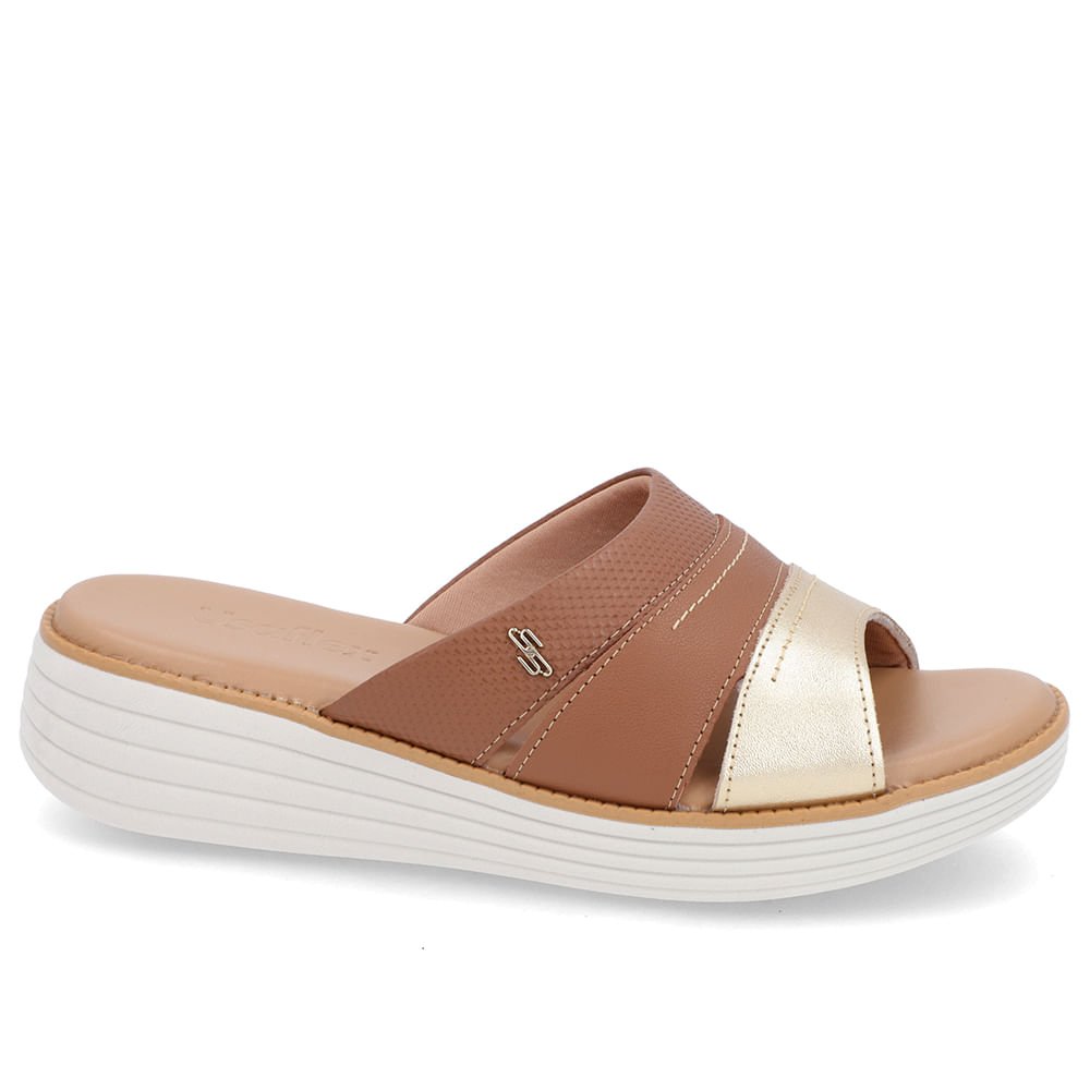 Tamanco cabedal em couro multi materiais nas cores ouro light e caramelo. O modelo possui tecnologia Sola+Conforto, desenvolvida para amenizar o impacto gerado pelas irregularidades do solo, os solados com espessura extra mantêm os pés confortáveis durante todo o tempo de uso do sapato.