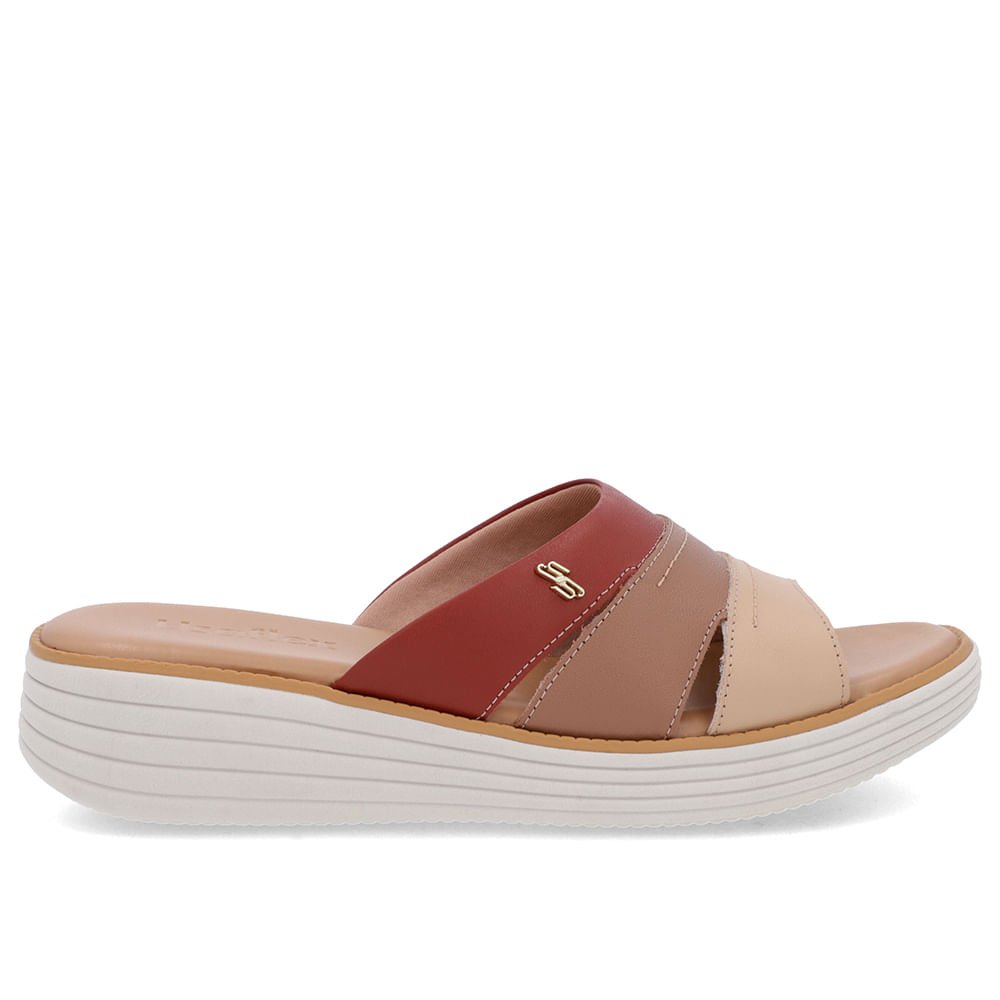 Tamanco cabedal em couro multi materiais nas cores blush camel e terracota. O modelo possui tecnologia Sola+Conforto, desenvolvida para amenizar o impacto gerado pelas irregularidades do solo, os solados com espessura extra mantêm os pés confortáveis durante todo o tempo de uso do sapato.
