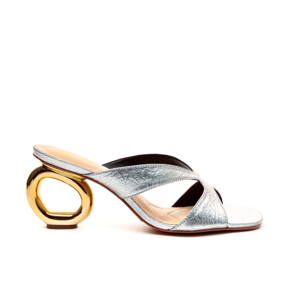 Tamanco Couro Prata Salto Médio Vazado Cecconello 2549002-11