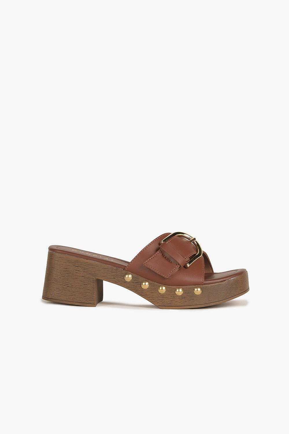 Tamanco Feminino Mundial Quinn com design robusto e moderno. Possui salto bloco com acabamento amadeirado que garante charme rústico e conforto ao caminhar. A gáspea é composta por tira larga em material sintético, com fivela decorativa e aplicação de tachas douradas na lateral, que trazem um toque de estilo e sofisticação ao modelo. Ideal para composições casuais com um toque fashion.