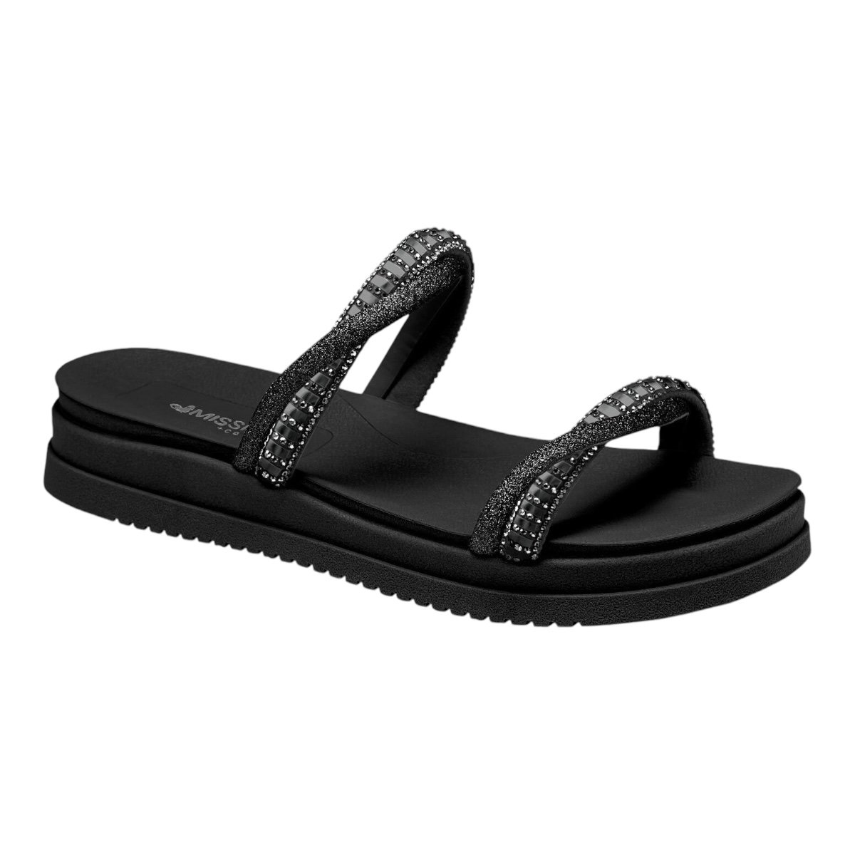O Slide Mississipi Flatform com Brilhos une conforto e estilo em um único calçado. Seu design minimalista e atemporal combina elementos clássicos com toques contemporâneos, resultando em um visual versátil e elegante. A parte superior da sandália é feita de tiras finas maleáveis de material sintético, que se adaptam perfeitamente aos pés, proporcionando conforto durante todo o dia. O destaque do modelo fica por conta das tiras entrelaçadas, uma delas repleta de aplicações, contrastando com os brilhos discretos da outra tira que adicionam um toque de glamour e sofisticação ao calçado. A sola flatform em EVA com 2,5 cm de altura confere um leve aumento na estatura e proporciona maior conforto ao caminhar, além de ser extremamente leve. A sandália é ideal para o dia a dia e momentos de lazer.