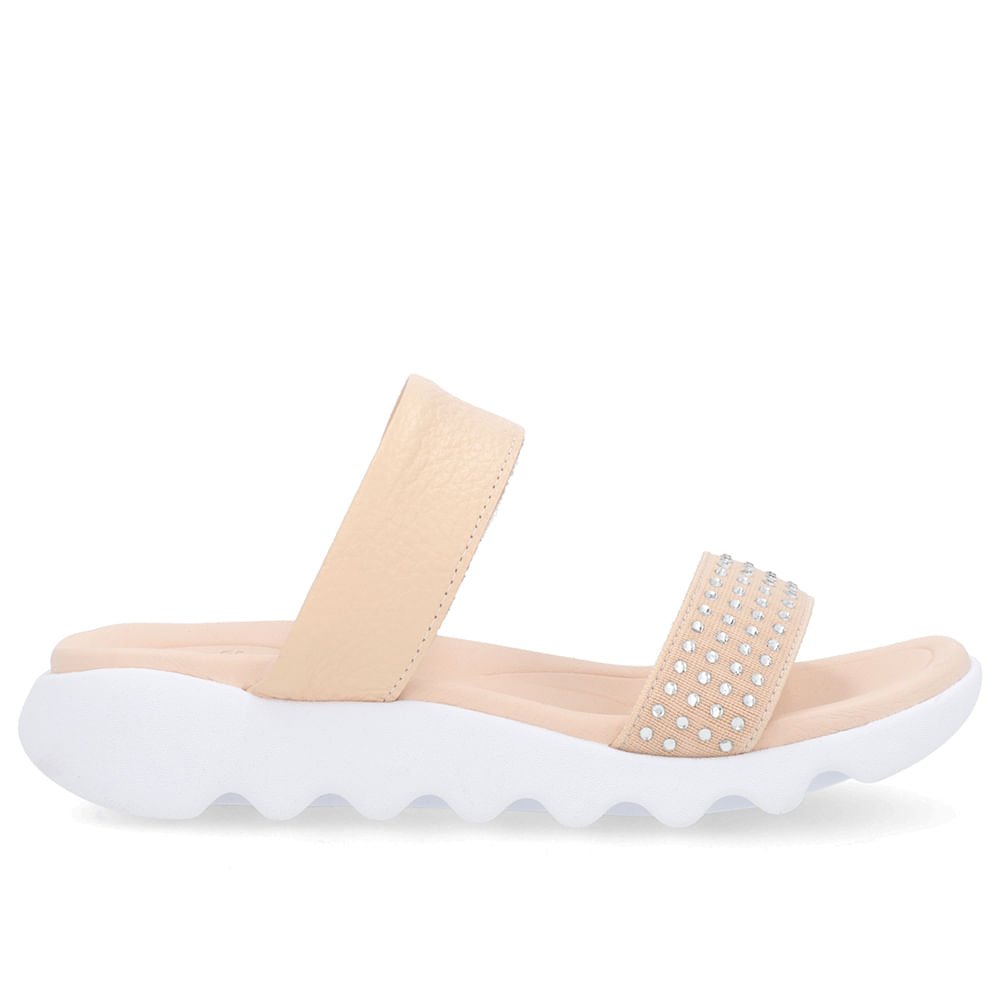 Tamanco cabedal em couro relax catalano e elástico na cor pessego suave.O modelo possui tecnologia Cuidado Intensivo, contendo palmilha com anatomia especial que alivia dores e desconfortos na sola do pé, causadas principalmente por inflamações como fascite plantar.