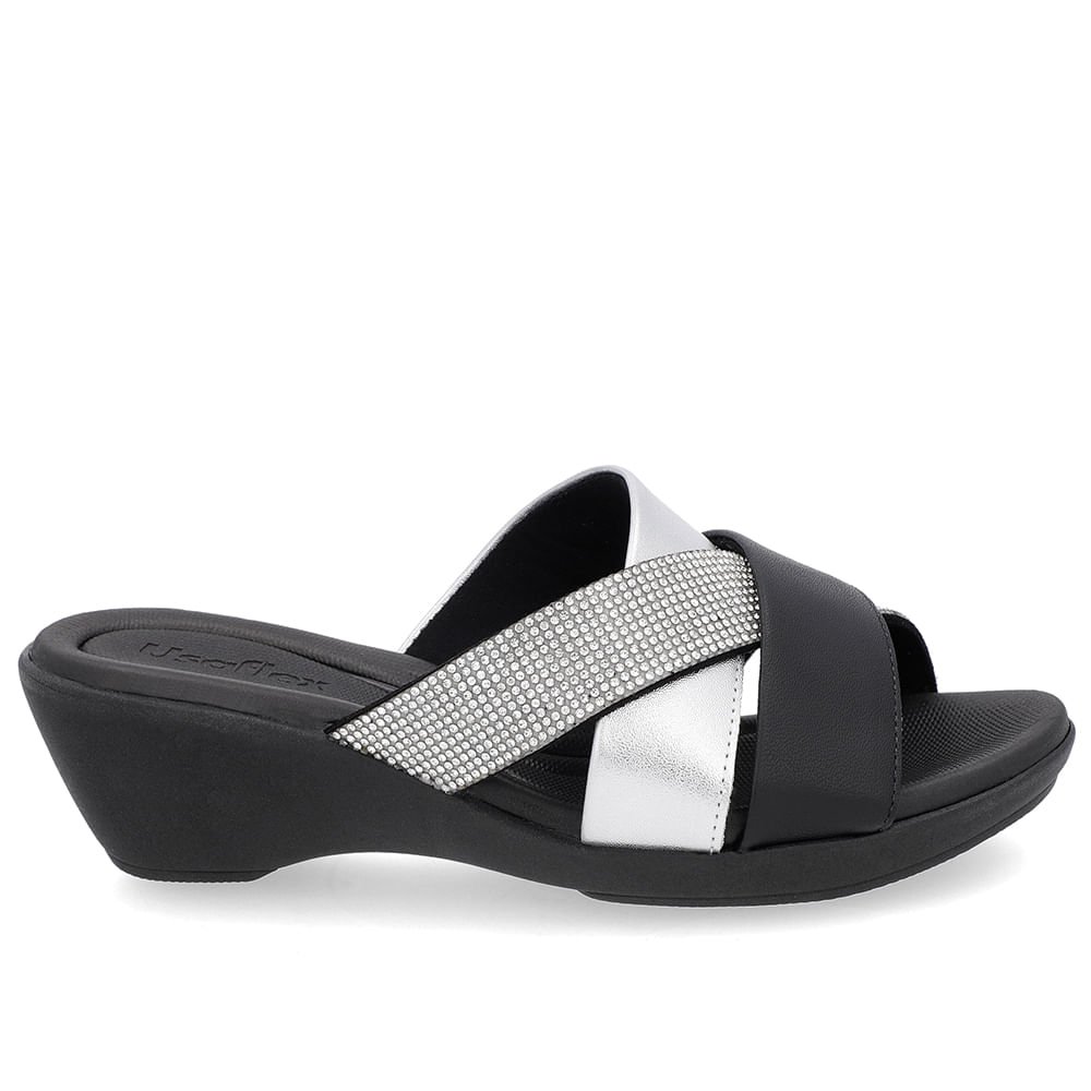 Tamanco cabedal em couro napa valise preto e soft slim silver detalhe em strass.O modelo possui tecnologia Sola+Conforto, desenvolvida para amenizar o impacto gerado pelas irregularidades do solo, os solados com espessura extra mantêm os pés confortáveis durante todo o tempo de uso do sapato.