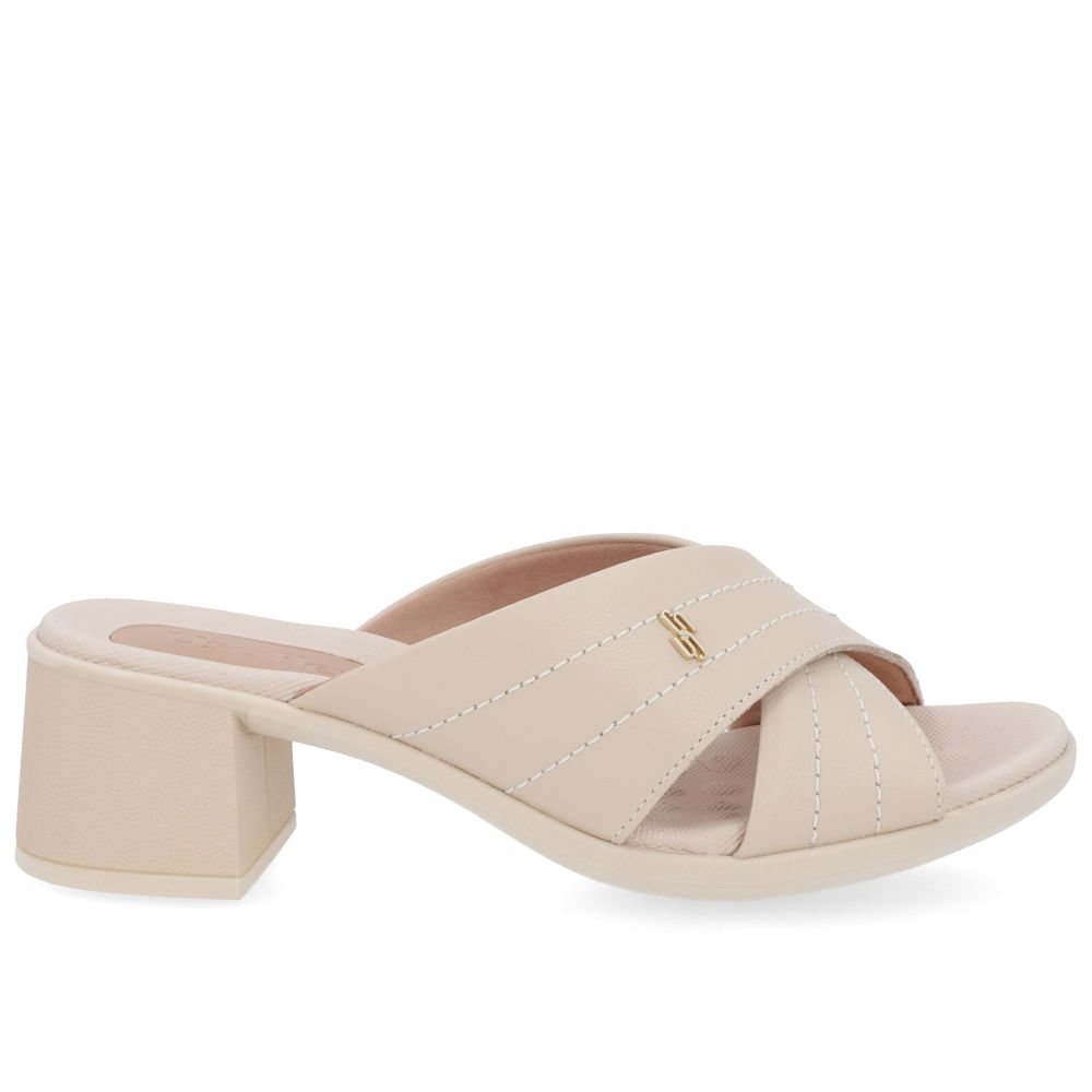 Tamanco Salto Bloco Couro Bege Tira Cruzada