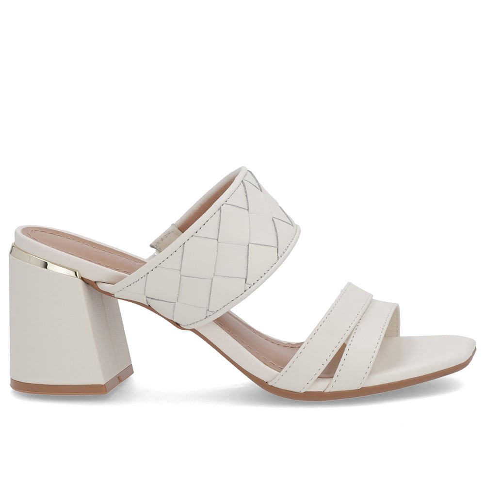 Tamanco Salto Bloco Couro Branco Marfim Trançado