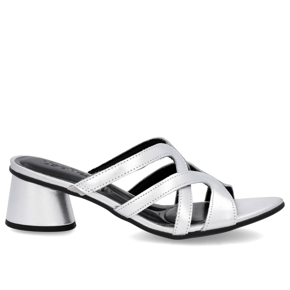 Tamanco salto geométrico cabedal em couro soft slim na cor silver. O modelo possui tecnologia +Bem-Estar, com espumas posicionadas em pontos estratégicos na palmilha garantindo conforto e suavidade na pisada.
