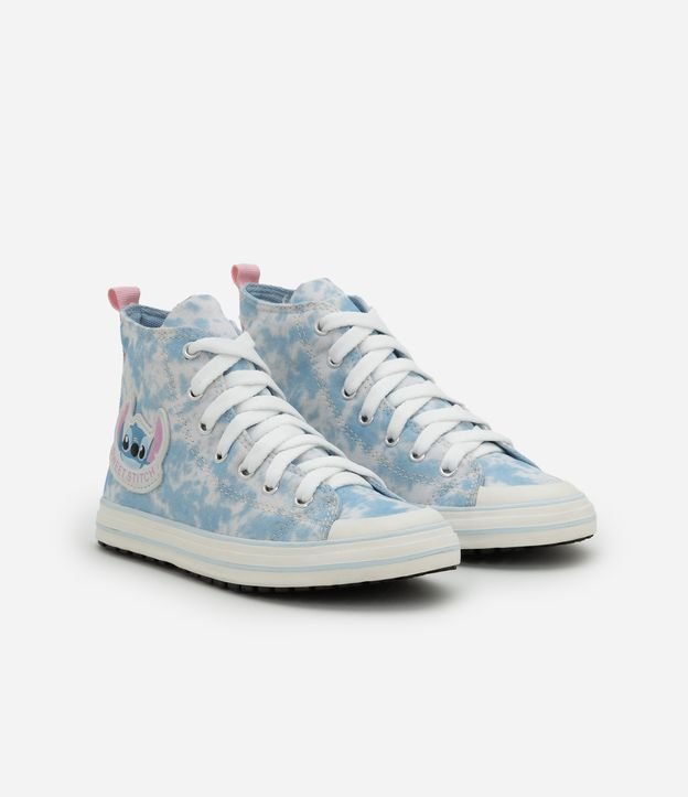 Tênis infantil de modelo abotinado, com fechamento por cadarço, bico redondo com atacador, puxador contrastante no calcanhar e estampa Tie Dye com patch do Stitch.