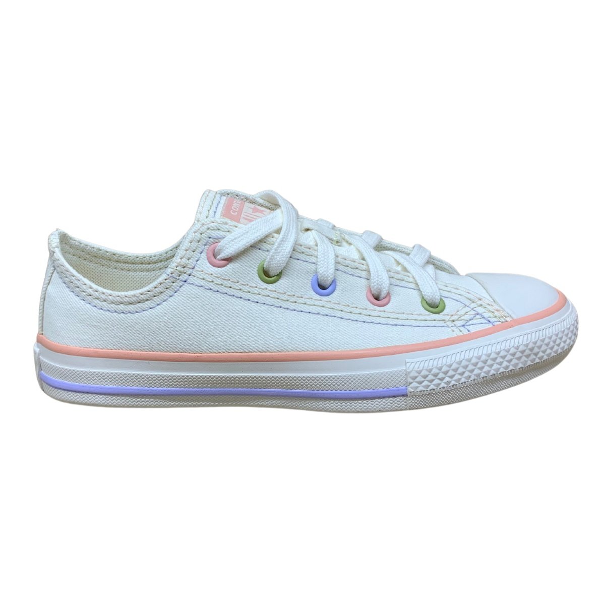 Apresentando detalhes na costura em cores lilás e rosa, o tênis Converse All Star Chuck Taylor Infantil possui cano baixo, oferecendo liberdade de movimento e estilo despojado para as pequenas.