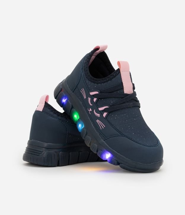 Tênis Calce Fácil Infantil com Sola LED e Estampa Gatinho - Tam 20 ao 27 Azul Marinho