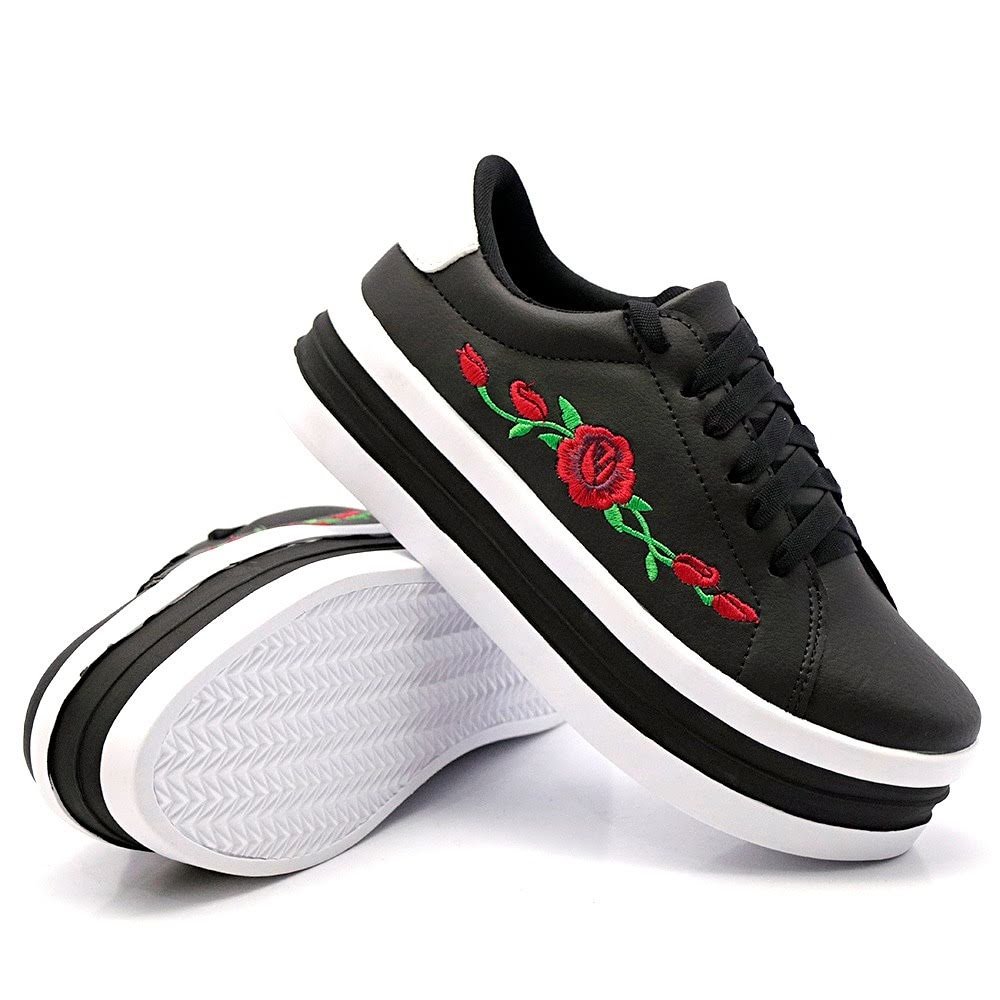 Tenis Casual Yoyo Store Detalhe Bordado Flor e Sola Alta Reta com Listras