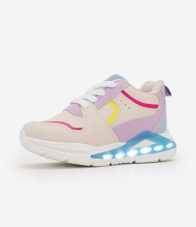 Tênis infantil com cano baixo, recortes contrastantes, fechamento por amarração e sola com luzinha LED.