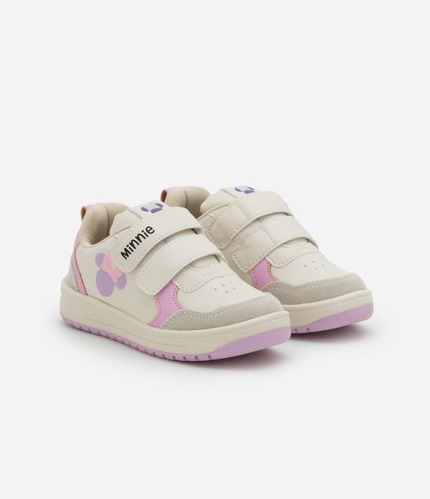 Tênis infantil confeccionado em material sintético. Possui fechamento por velcro, bico redondo, cano baixo, sola bicolor, recortes contrastantes, furinhos respiráveis e estampa da Minnie Mouse.
