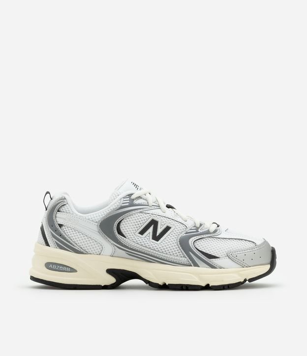 Tênis no modelo jogging com bico redondo, atacador, cadarço, furinhos, recortes. Peça com cano baixo, sola contrastante no modelo 530 New Balance.