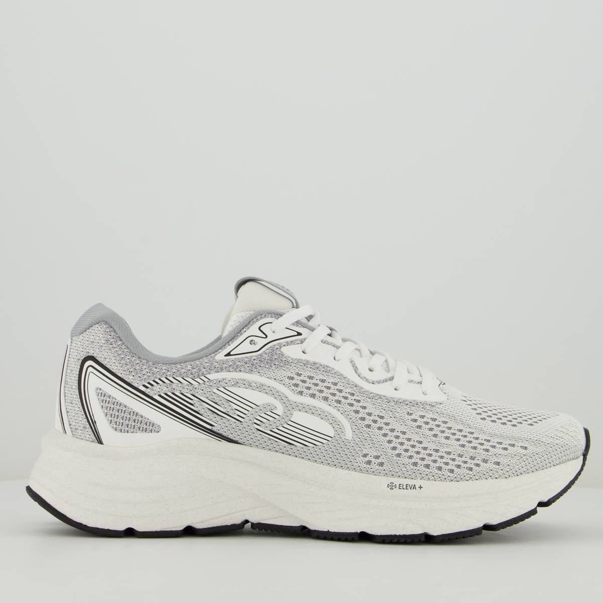 Eleva+: Tecnologia que explora o limite de expansão do EVA para alcançar máxima resposta, proporcionando o efeito trampolim, absorvendo o impacto da passada e transformando essa energia em impulsão.