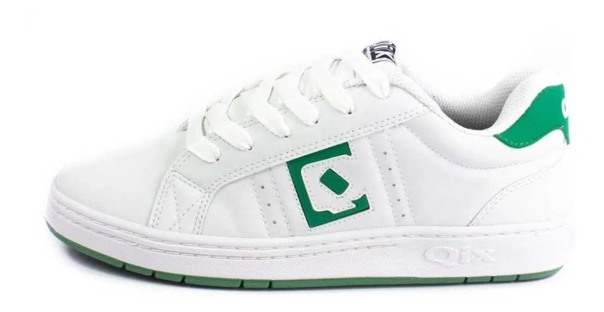 E o tenis para que pode ser usado em diferentes ocasioes, sempre garantindo o seu estilo com conforto, o cabedal e confeccionado por material sintetico de cor branco, o forro e feito em nylon com espuma poliuretano, a lingueta e branca com a etiqueta da marca costura em verde, sua palmilha e de EVA 6mm com nylon, sua sola e caixa de borracha, cadarco de poliester, sua lateral tem um detalhe da letra Q com o fundo verde.