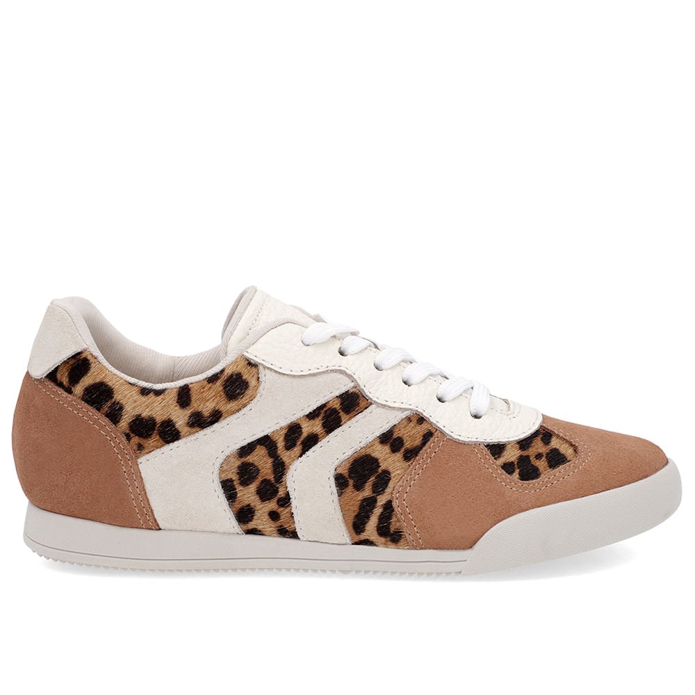 Tênis cabedal em couro multimateriais na cores camel multileopado marfim e gelo. O modelo possui tecnologia Couro, com conforto, maciez e durabilidade.