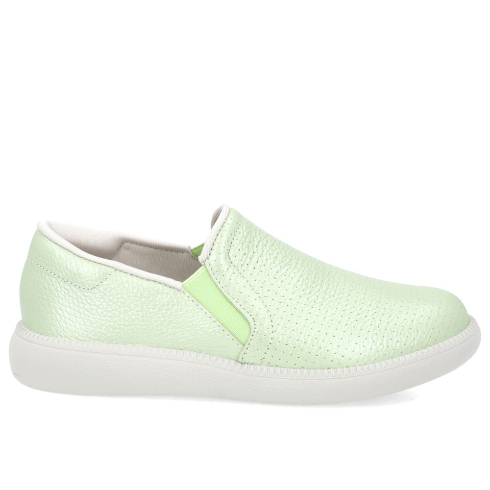 Tênis slip on cabedal em couro floater metal color na cor verde mentolado. O modelo possui tecnologia Memória Permanente, com material de capacidade de retorno e mantêm o formato dos seus pés na palmilha.