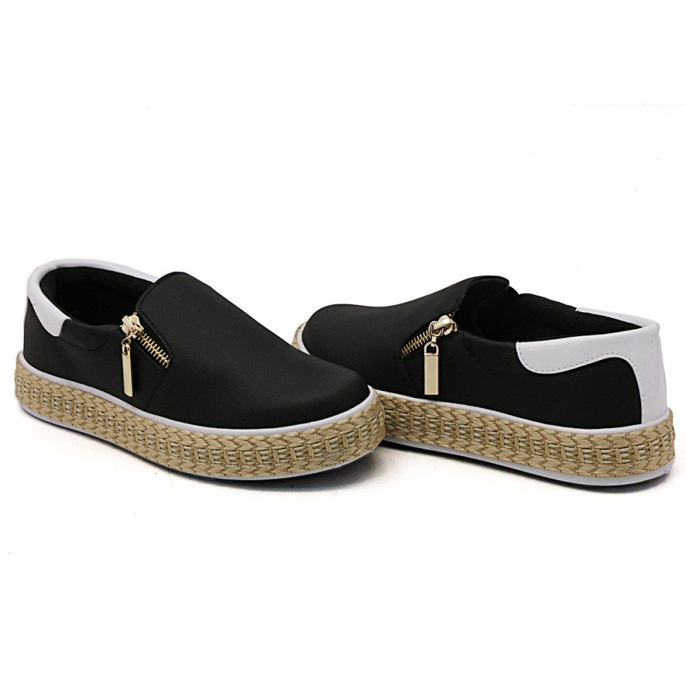 Tênis Slip On Yoyo Store com Recortes Ziper Lateral e Sola Reta em Sisal Preto
