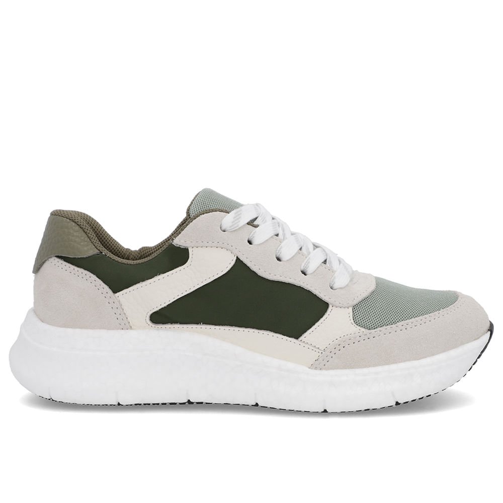 Tênis cabedal multi materiais na cores gelo marfim e militar. A nova tecnologia sola+leve ultra é feita com e-tpu e oferece excelente amortecimento, retorno de energia, durabilidade, leveza e flexibilidade, elevando o bem-estar da nossa consumidora a outro nível.