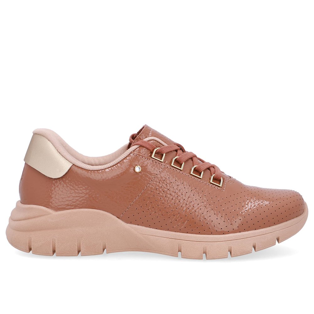 Tênis cabedal em couro verniz show camel, detalhe em laser fechamento cadarço. O modelo possui tecnologia Antibacteriano, com forro que reduz a propagação de fungos e bactérias.