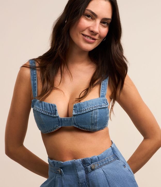 Top  de Alça em Jeans com Vira do Decote e Fivela nas Costas