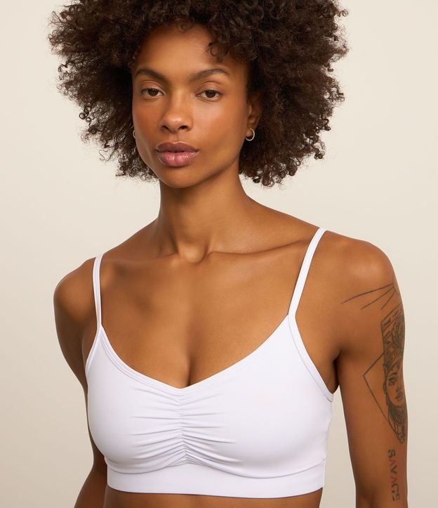 Top esportivo feminino, confeccionado em microfibra, com alcinha fina e detalhe franzido frontal.