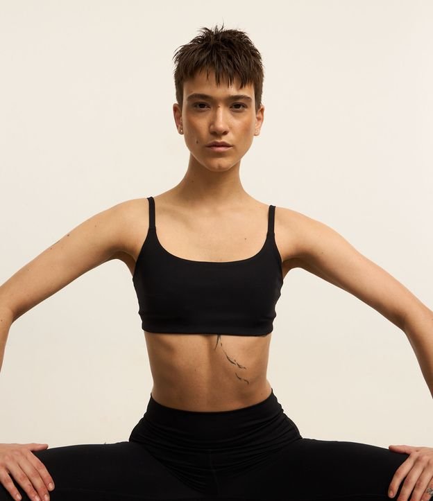 Top feminino esportivo em poliamida, com alças finas e sem estampa.