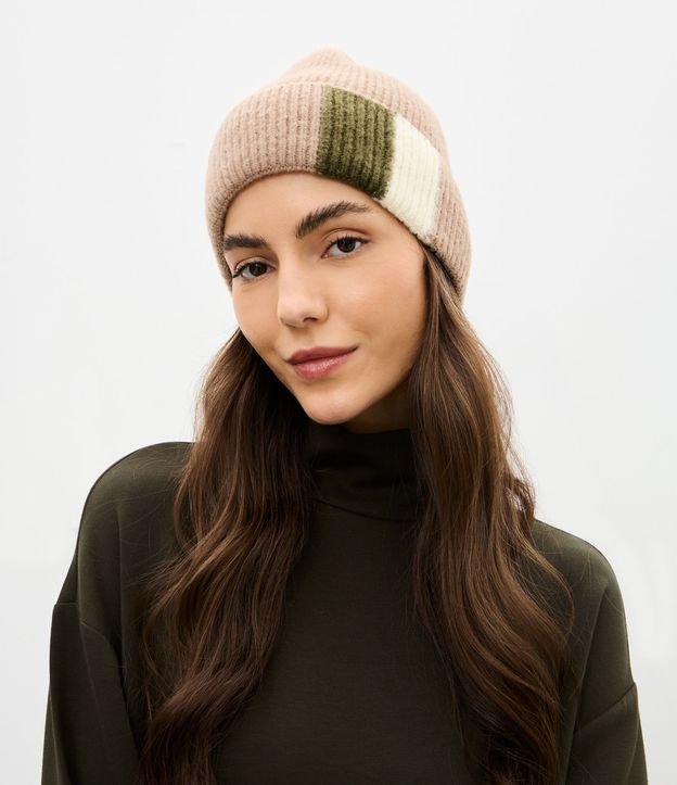 Touca feminina confeccionada em tricô, possui barra dobrada e detalhes de bloco de cor.