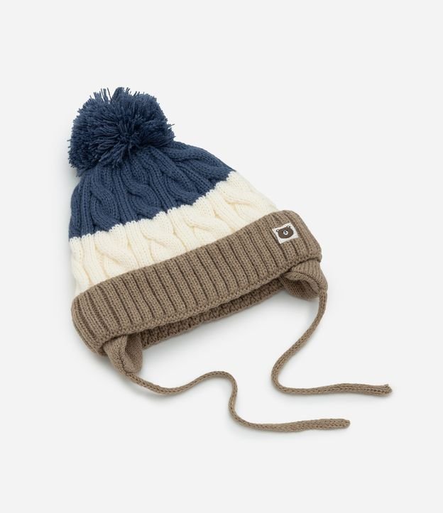 Touca infantil em tricô com textura canelada e estampa listrada. Possui pompom volumoso no topo, forro interno para aquecimento e amarração lateral em cordão, garantindo ajuste seguro para bebês de 0 a 12 meses.