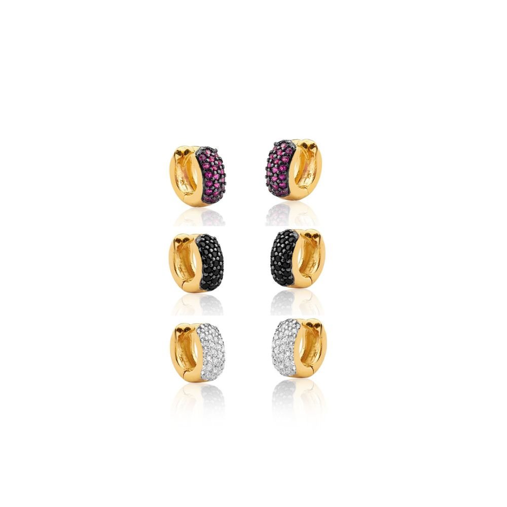 Trio de Brinco de Argolas Pequenas com zirconias brancas, negras e rubi banhado em ouro Dourado
