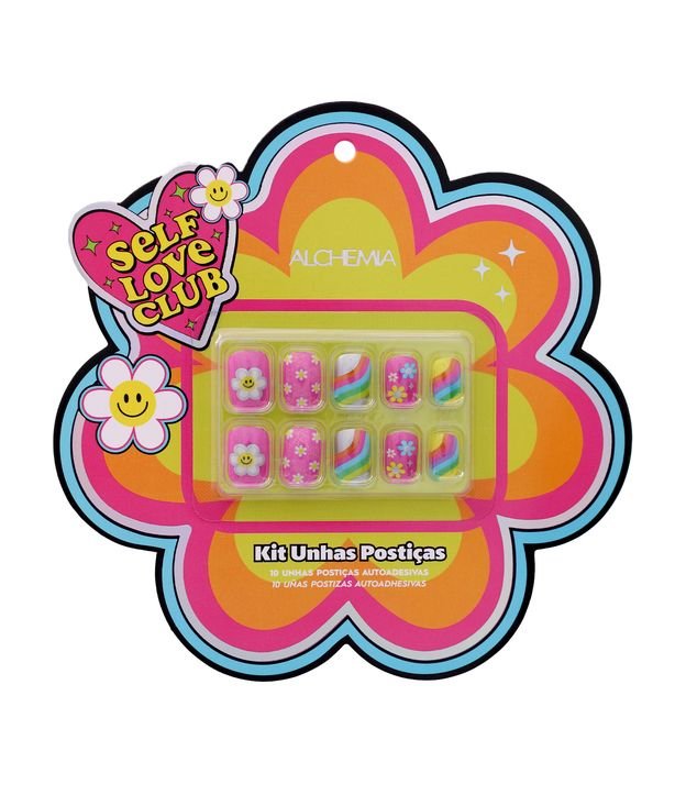 Transforme seu visual com este kit divertido e prático de unhas postiças autoadesivas da coleção Self Love Club da Alchemia. O pacote contém 10 unhas postiças com designs vibrantes e coloridos, incluindo estampas florais e arco-íris, perfeitas para quem ama um toque criativo e alegre nas mãos.