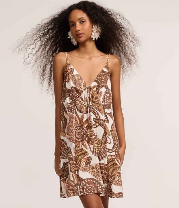 Vestico Curto com Alça Fina e Estampa Fundo do Mar Marrom / Off White