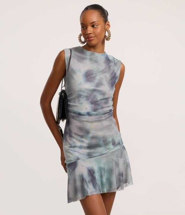 Vestido feminino confeccionado em tul através de boas práticas ambientais, no modelo ajustado. Possui decote canoa, sem mangas, padronagem com efeito manchado em tons suaves, babados na barra e caimento leve, ideal para looks modernos e confortáveis.