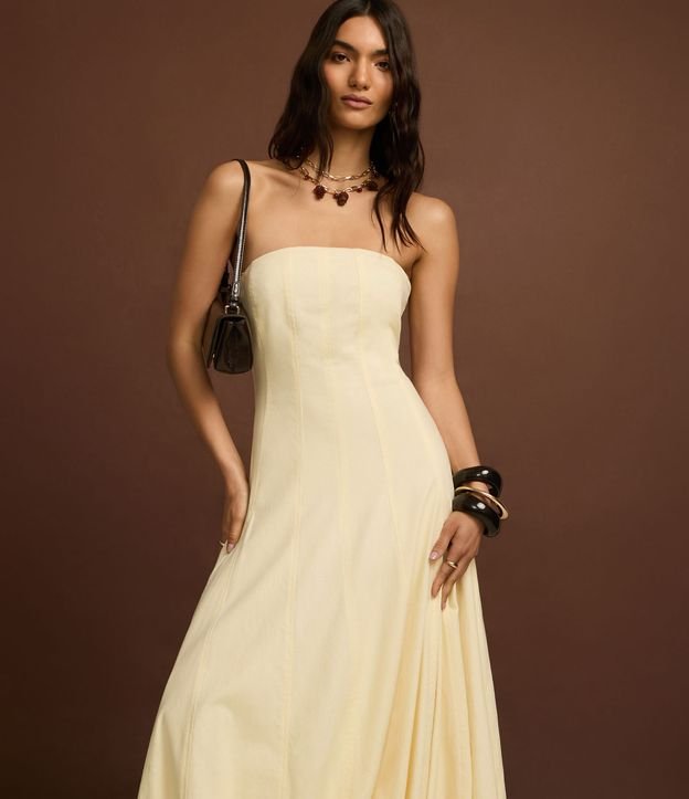 Vestido Balonê Midi Sem Alça em Viscolinho com Pregas Amplas Amarelo