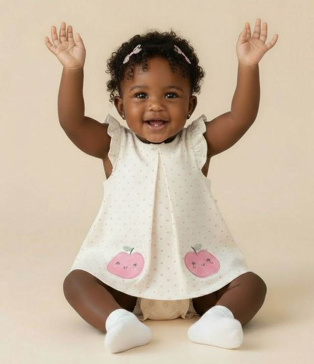 Vestido body infantil confeccionado em algodão mais sustentável, com gola redonda, manga curta, preguinha frontal, fechamento no entrepernas e bordado de maçãzinha com fundo em poá.