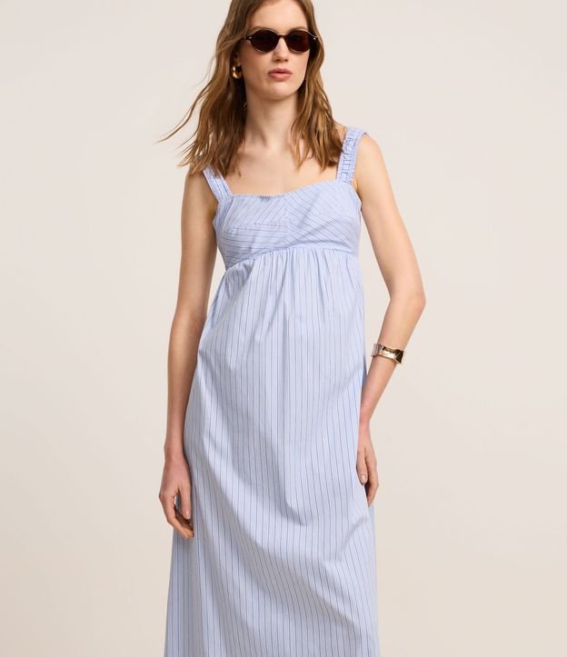Vestido de alças largas com elásticos, confeccionado em tricoline, com decote quadrado, lastex nas costas e listras verticais. Este produto possui algodão certificado BCI em sua composição, além de ter sido produzido através de processos mais sustentáveis com boas práticas ambientais, sendo ambientalmente mais responsável.