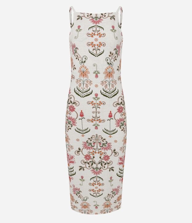 Vestido Canelado com Decote Quadrado e Estampa de Arabesco Branco
