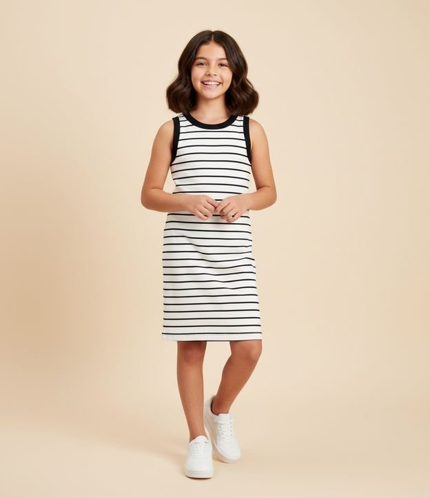 Vestido canelado infantil com gola redonda, cava americana e estampa listrada.