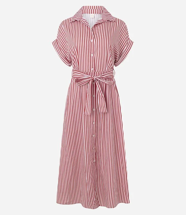 Vestido Chamise com Faixa na Cintura e Estampa Listrada Vermelho