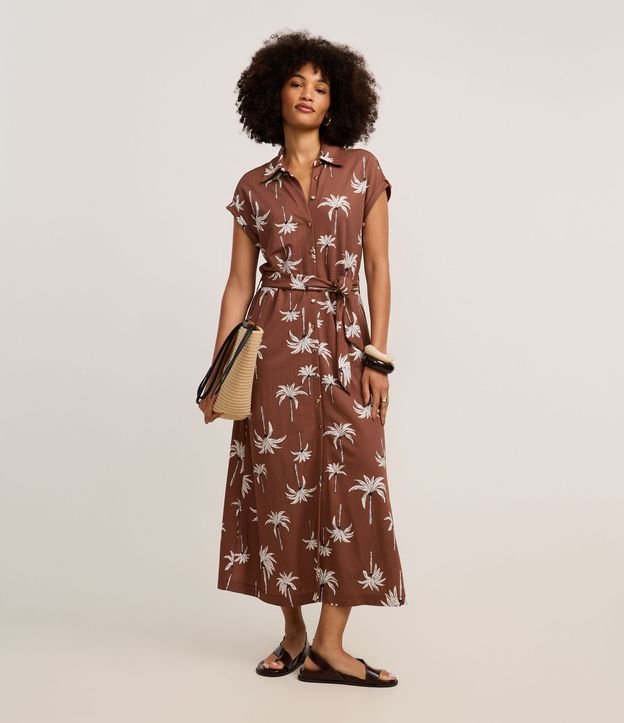 Vestido Chemise New Midi em Viscose com Estampa Coqueiros Marrom
