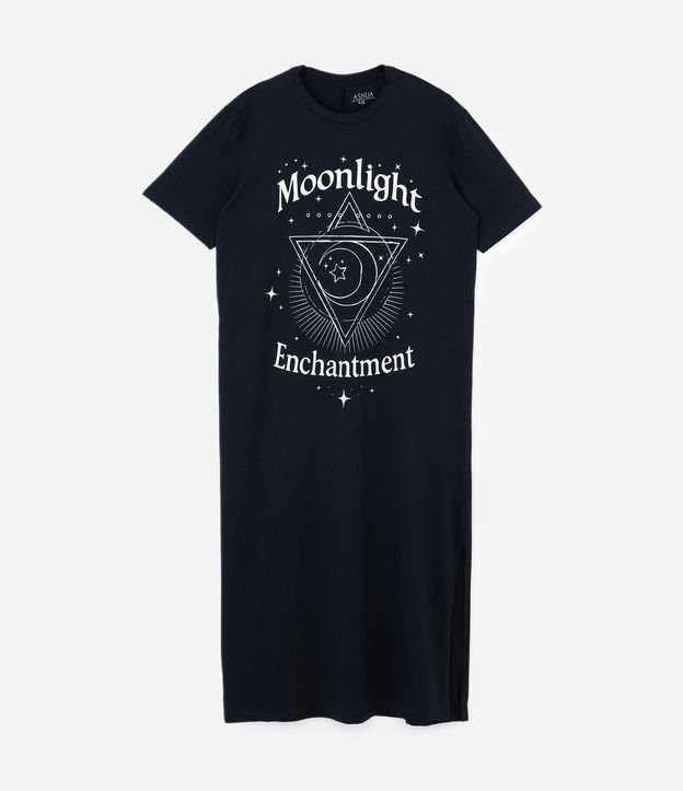 Vestido feminino confeccionado em algodão mais sustentável através de boas práticas ambientais no modelo comfort. Possui gola redonda, manga curta, estampa lettering "Moonlight Enchantment" e comprimento longo.