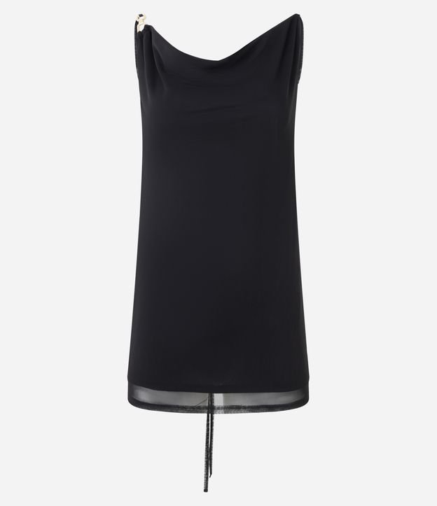 Vestido feminino curto confeccionado em tule através de boas práticas ambientais. Possui decote drapeado frontal e posterior, alças finas com argola metálica, faixa para amarração na linha abaixo do busto. Possui leve transparência na barra inferior.