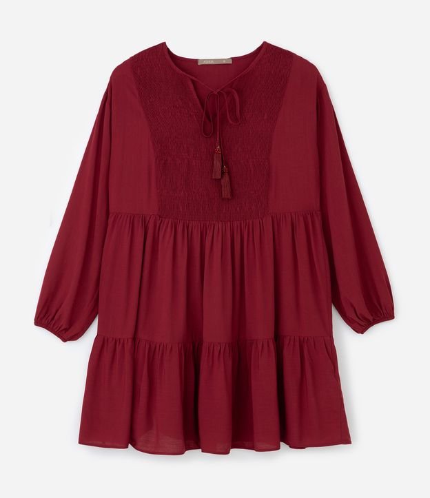 Vestido curto em viscose com mangas longas e decote V acompanhado de amarração com tassel. O efeito franzido frontal valoriza o caimento e traz conforto ao vestir. Peça soltinha, leve e perfeita para compor produções do dia a dia com estilo.