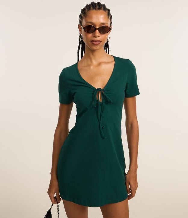 Vestido Curto em Algodão Liso Com Decote em V com Amarração Frontal Verde