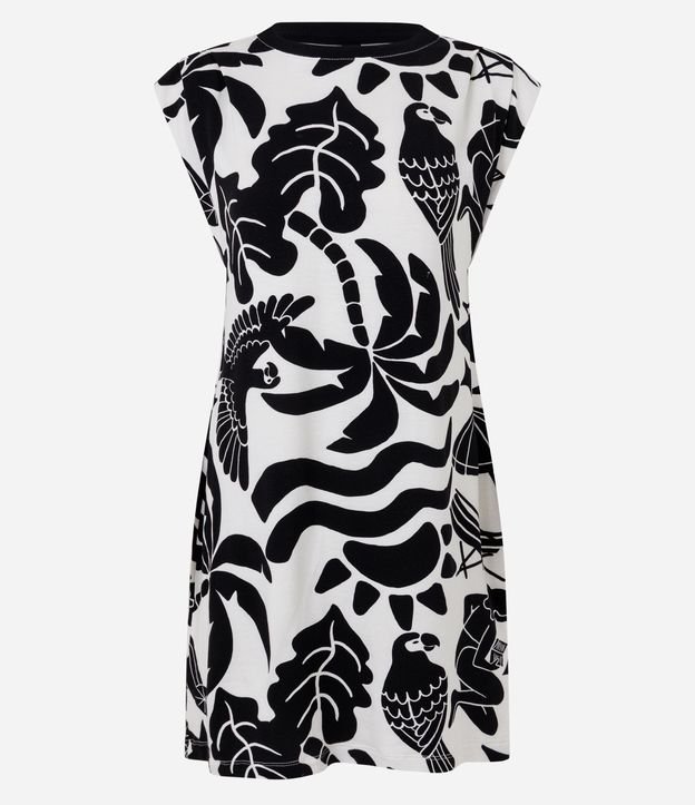 Vestido Curto em Crepe Bicolor com Estampa Tropical Branco/Preto