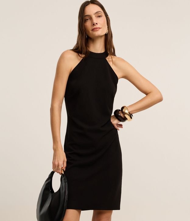 Vestido curto e sem mangas, confeccionada em crepe, com gola halter.