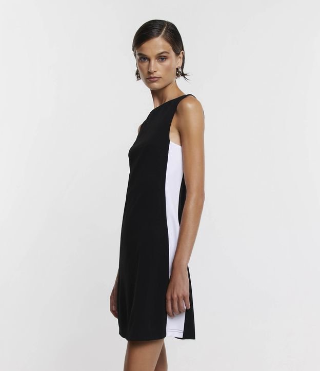 Vestido curto em crepe com gola redonda, sem manga, fechamento nas costas por zíper e detalhe contrastante nas laterais.
