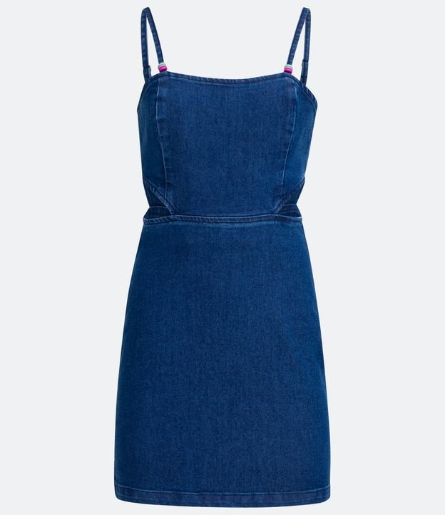 Vestido Curto em Jeans com Alças Finas e Vazados na Cintura